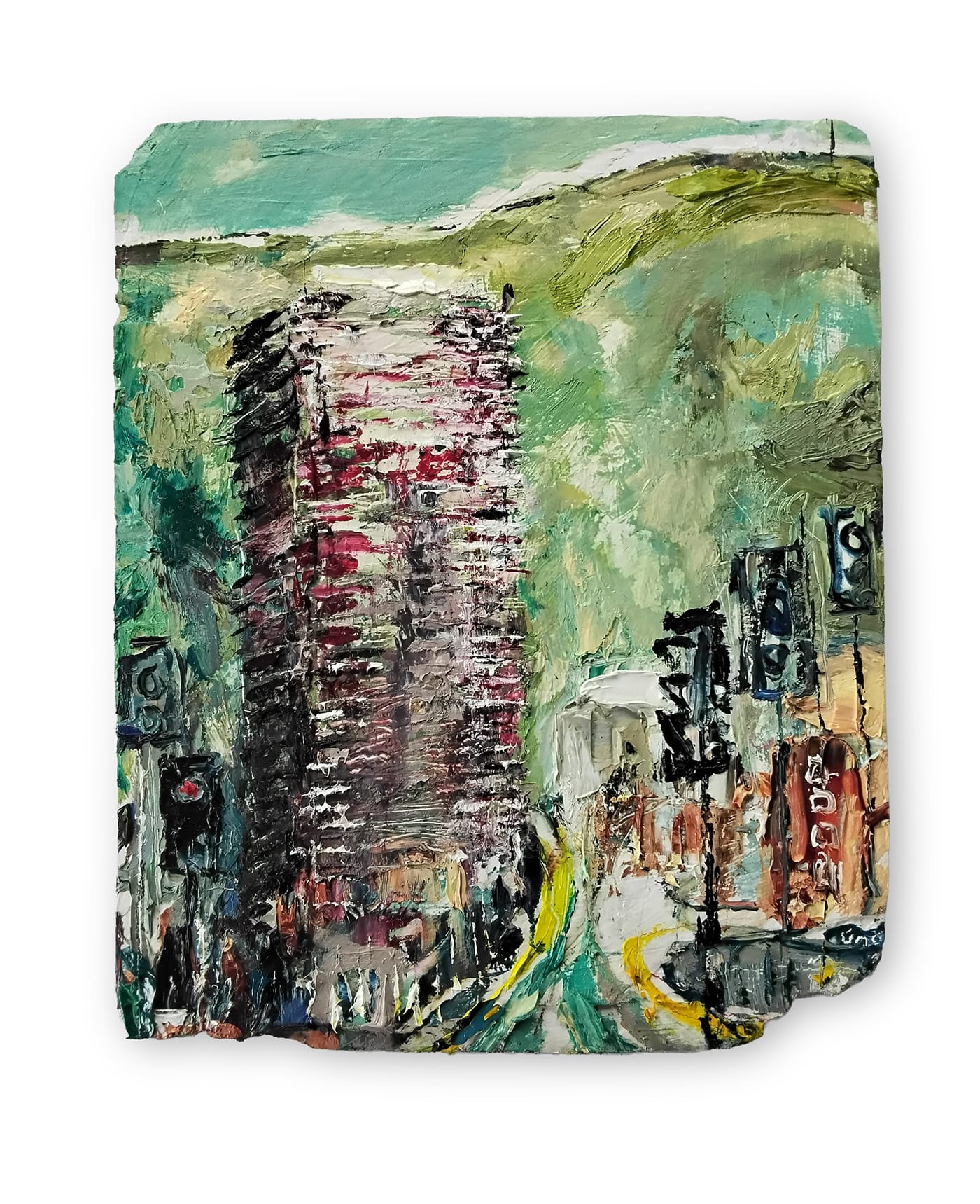 The tower casts a heavy shadow over the road yet contrasting vibrant flashes of reds and yellows peek through in the form of red paint, stop signs and the double yellow lines on the road that entice our eye up the ‘Falls’.